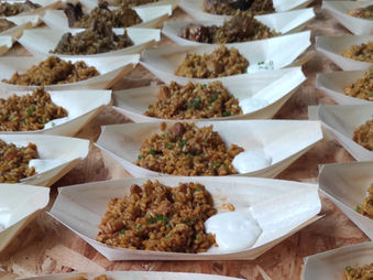 Arroz de pescado con base de calamar, sepia y rape. Con langostinos y gambones pelados y troceados, acompañado de suave ali-oli de ajo confitado.